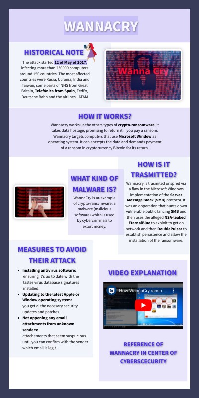 The attack started 12 of May of 2017, infecting more than 230000 computers around 150 countries. The most affected countries were Rusia, Ucrania, India and Taiwan, some parts of NHS from Great Britain, Telefónica from Spain, FedEx, Deutsche Bahn and the airlines LATAM