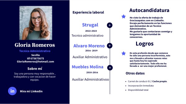 He visto la oferta de trabajo de Graciazapatos.com en Linkedin.Encajo perfectamente en las funciones que demandan de un Tecnico Administrativo. Me gustaria que contactaran conmigo y tengamos la oportunidad de conocernos.