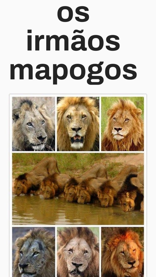 Os irmãos mapogos foram um grupo de 6 leões machos que dominaram a reserva de sabi sand na africa do sul entre os anos de 2006-2012 hoje vou contar a historia deles..... Os leões mapogos nasceram no ano de 2001-2002 no bando de leões que se chamava esparta esse grupo era dominado por 5 leões machos que eram conhecidos como os west street que dominavam o bando esparta desde 2000. Os leões west street eram otimos caçadores e as leoas espartas eram tambem otimas caçadoras no ano de 2001-2002 nasceram 10 filhotes no bando esparta 5 machos e 5 femeas.