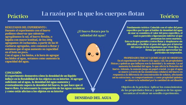 CONCLUSIÓN: El experimento demuestra cómo la densidad de un líquido influye en la flotabilidad de los objetos en su interior. Al agregar suficiente sal al agua, la densidad del agua aumenta y eventualmente supera la densidad del huevo, lo que hace que el huevo flote. Es interesante la composición de las aguas oceánicas y como estás afectan a los objetos en su interior