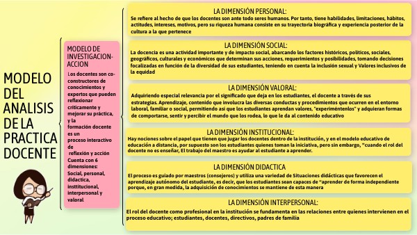 Los docentes son co-constructores de conocimientos y expertos que pueden reflexionar críticamente y mejorar su práctica, y la formación docente es un proceso interactivo de reflexión y acción Cuenta con 6 dimensiones: Social, personal, didactica, insttitucional, interpersonal y valoral