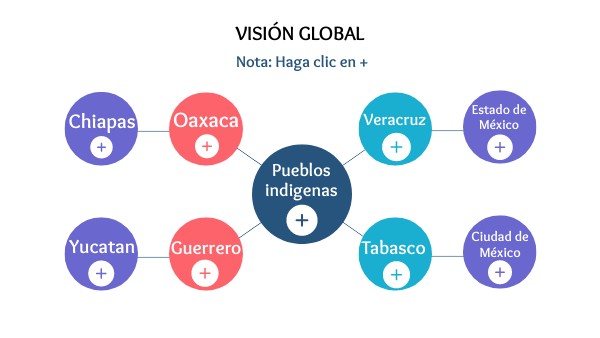 Norte: Baja California, Sonora, Chihuahua, Coahuila, Nuevo León, Tamaulipas. Centro: Sinaloa, Durango, Zacatecas, San Luis Potosí, Nayarit, Jalisco, Aguascalientes, Guanajuato, Querétaro, Hidalgo, Estado de México, Ciudad de México. Sur: Morelos, Puebla, Tlaxcala, Veracruz, Oaxaca, Chiapas, Tabasco, Campeche, Yucatán, Quintana Roo. Pero en esta ocasión solo veremos algunos de los estados donde predominan la presencia indigena que son lo estados de Oaxaca, Chiapas, Guerrero, Veracruz, Estado de México, Ciudad de México, Yucatan y Campeche