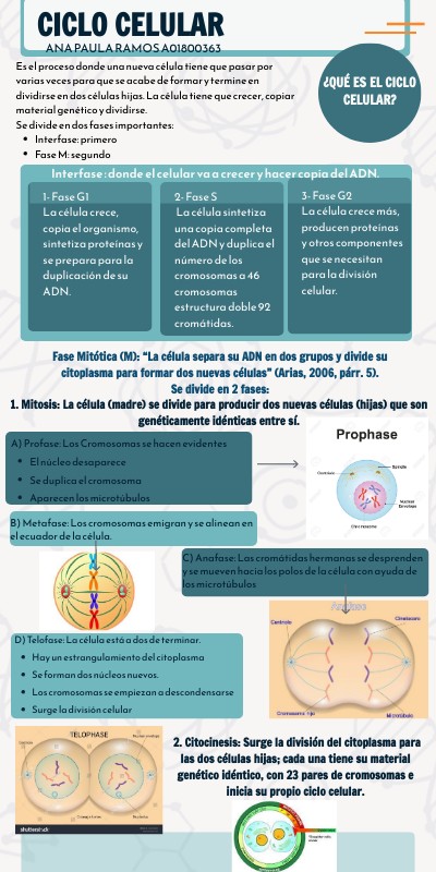 Fase Mitótica (M): “La célula separa su ADN en dos grupos y divide su citoplasma para formar dos nuevas células” (Arias, 2006, párr. 5).Se divide en 2 fases: