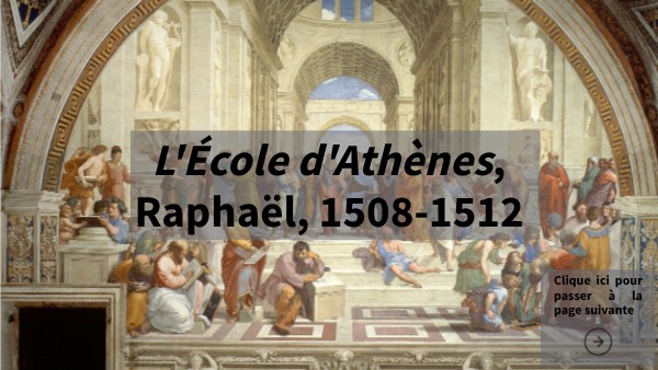 Voici L'École d'Athènes, du peintre italien Raphaël. Tu vas pouvoir la découvrir en cliquant sur les différentes sections.