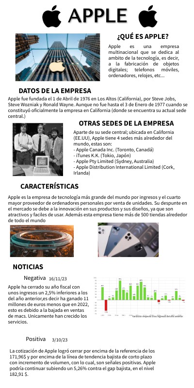 Apple es una empresa multinacional que se dedica al ambito de la tecnología, es decir, a la fabricación de objetos digitales; telefonos móviles, ordenadores, relojes, etc...