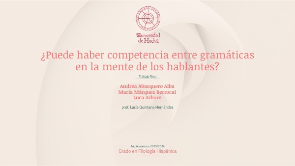 El presente trabajo es el resultado de la atenta lectura del libro 60 Problemas de Gramática (2011) de Escandell Vidal, V., Leonetti, M. y Sánchez Lopez, C. de Ediciones Akal. En concreto, este trabajo en grupo supone una reseña del capítulo25.¿Puede haber competencia entre gramáticas en la mente de los hablantes? El objetivo de la reseña por tanto será a) contextualizar el capítulo dentro de la disciplina gramatical, b) resumir dicho capítulo, c) analizar el texto de forma crítica y d) proponer una hipótesis o solución práctica al problema planteado.
