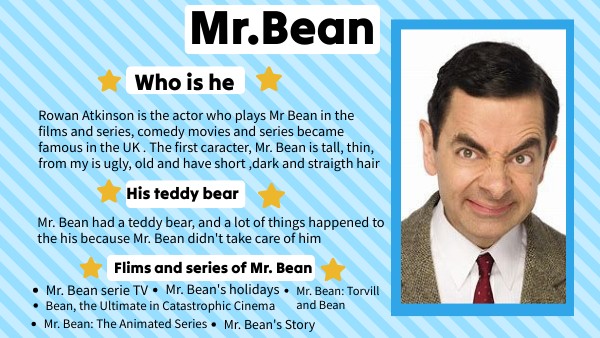 Rowan Atkinson is the actor who plays Mr Bean in the films and series, comedy movies and series became famous in the UK . The first caracter, Mr. Bean is tall, thin, from my is ugly, old and have short ,dark and straigth hair