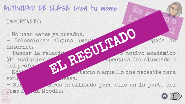 IMPORTANTE:- No usar memes ya creados. - Seleccionar alguna imagen propia o descargada de internet. - Buscar la relación con algún hecho o motivo académico (de cualquier etapa y desde la perspectiva del alumnado o del profesorado). - Editarla para añadirle texto o aquello que necesite para expresar lo que se desea. - Subir a la tarea habilitada para ello en la parte del Tema 1 de la Moodle.