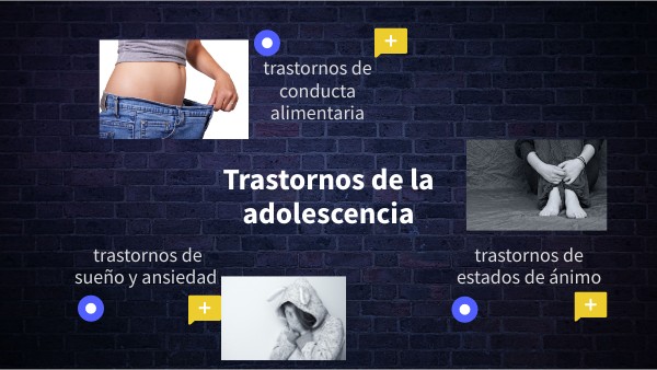 Los trastornos del sueño que sufre el adolescente son: insomnio:dificultad para iniciar, mantener el sueño, o volver a dormir. hipersomnia: dormir más de 9 horas, dificultad para mantenerse despierto y con energía. narcolepsia: ataques de sueño, paralisis del sueño, alteraciones hipnagógicas y cataplejía. parasomnia: interrupción anormal del sueño, caminar durmiendo, hablar durmiendo, padecer pesadillas, enuresis nocturna, ronquidos o convulsiones. La ansiedad se puede presentar por: separación, mutismo selectivo, ansiedad social, pánico, agorafobia o ansiedad generalizada.