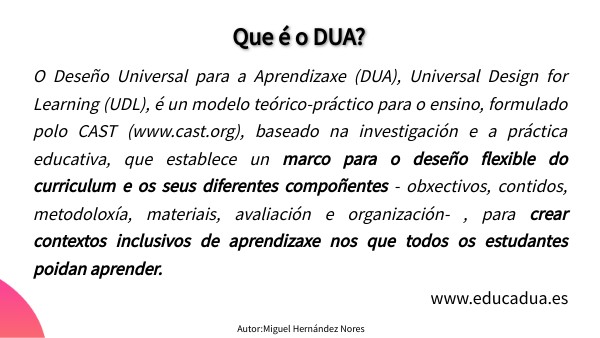 O Deseño Universal para a Aprendizaxe (DUA), Universal Design for Learning (UDL), é un modelo teórico-práctico para o ensino, formulado polo CAST (www.cast.org), baseado na investigación e a práctica educativa, que establece un marco para o deseño flexible do curriculum e os seus diferentes compoñentes - obxectivos, contidos, metodoloxía, materiais, avaliación e organización- , para crear contextos inclusivos de aprendizaxe nos que todos os estudantes poidan aprender.