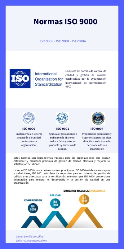 Estas normas son herramientas valiosas para las organizaciones que buscan establecer y mantener prácticas de gestión de calidad efectivas y mejorar su satisfacción del cliente. La serie ISO 9000 consta de tres normas principales: ISO 9000 establece conceptos y definiciones, ISO 9001 establece los requisitos para un sistema de gestión de calidad y es adecuada para la certificación, mientras que ISO 9004 proporciona orientación para mejorar el desempeño y la gestión de calidad en una organización.