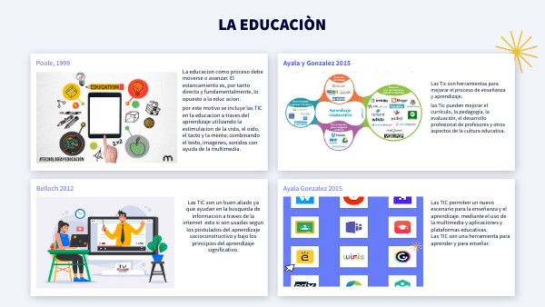 La educacion como proceso debe moverse o avanzar. El estancamiento es, por tanto directa y fundamentalmente, lo opuesto a la educ acion. por este motivo se incluye las TIC en la educacion a traves del aprendizaje utilizando la estimulacion de la vista, el oido, el tacto y la mente; combinando el texto, imagenes, sonidos con ayuda de la multimedia.