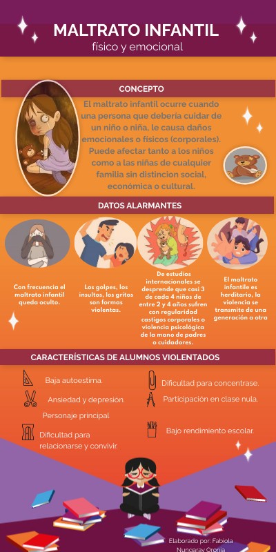 El maltrato infantil ocurre cuando una persona que debería cuidar de un niño o niña, le causa daños emocionales o físicos (corporales). Puede afectar tanto a los niños como a las niñas de cualquier familia sin distincion social, económica o cultural.