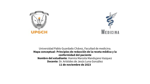 Universidad Pablo Guardado Chávez, Facultad de medicina.Mapa conceptual- Principios de redacción de la receta médica y la conformidad del pacienteNombre del estudiante: Hannia Marcela Mandujano Vazquez Docente: Dr. Arístides de Jesús Luna González 11 de noviembre de 2023