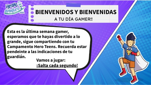 Esta es la última semana gamer, esperamos que te hayas divertido a lo grande, sigue compartiendo con tu Campamento Hero Teens. Recuerda estar pendeinte a las indicaciones de tu guardián.