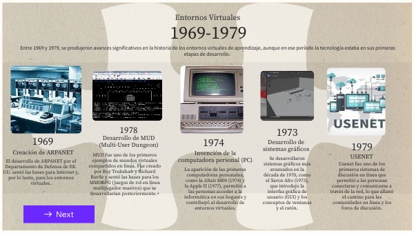 Entre 1969 y 1979, se produjeron avances significativos en la historia de los entornos virtuales de aprendizaje, aunque en ese período la tecnología estaba en sus primeras etapas de desarrollo.