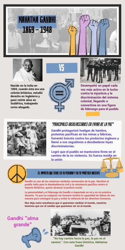 Gandhi es uno de los máximos símbolos universales de la paz. Movilizó al pueblo indio para la desobediencia civil y la resistencia pacífica contra el Imperio Británico, quería alcanzar la justicia social. La personalidad y el liderazgo de Gandhi a impactado en mi y en mi práctica docente. Ya que no cualquier ser humano tendria la capacidad de liderar de esa manera para conseguir la paz y evitar la violencia de los derechos humanos. Nos deja como enseñanza que si queremos cambiar el mundo, nosotros tenemos que ser el cambio que queremos ver en el mundo.