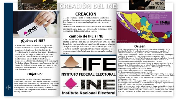 El INE, antes Instituto Federal Electoral (IFE), tiene origen desde 1917 con la Constitución Política de los Estados Unidos Mexicanos, promulgada el 5 de febrero de ese año. La cual, instituye a la Junta Empadronadora, las juntas Computadoras Locales y los Colegios Electorales como organismos para elegir al Presidente de la República y los miembros del Congreso de la Unión. Para 1946, el presidente Manuel Ávila Camacho promulga la Ley Federal Electoral y crea la Comisión Federal de Vigilancia. Asimismo, ordena la creación de comisiones electorales locales y el Consejo del Padrón Electoral. En 1951, las reformas electorales para el registro de nuevos partidos políticos, el Congreso de la Unión aprueba reformar la Ley Federal Electoral para que la Comisión Federal de Vigilancia Electoral pueda arbitrar el registro de nuevos partidos políticos y emitir constancias de mayoría. ¿Cuándo y por qué razón se creó el organismo del INE? El INE se encarga de las jornadas electorales | INE La Comisión Federal de Vigilancia Electoral desaparece para 1973 y, en su lugar, el Congreso de la Unión aprueba la creación de la Comisión Federal Electoral. En ese órgano participan con voz y voto los representantes de todos los partidos políticos con registro legal. Tan solo cuatro años después, para 1977, se expide la ley de organizaciones políticas y procesos electorales, la cual estableció las reglas para la participación y competencia de los partidos en el sistema electoral. En 1986 se crea un nuevo código federal electoral, el cual sustituyó la Ley Federal de Organizaciones Políticas y Procedimientos Electorales. Entre sus aportaciones destaca la desaparición del registro condicionado de partidos, asimismo, precisó el acceso a los medios de comunicación y recursos económicos de los partidos.