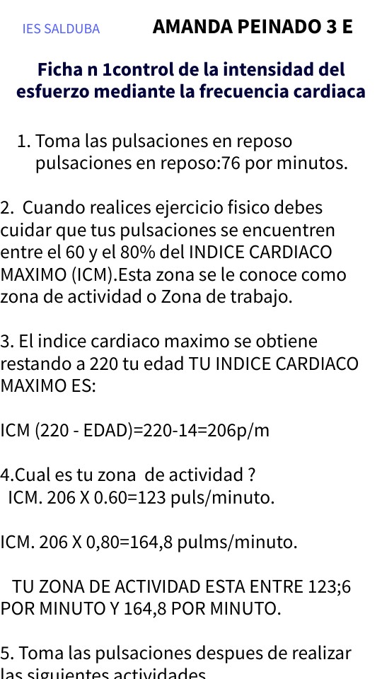 2. Cuando realices ejercicio fisico debes cuidar que tus pulsaciones se encuentren entre el 60 y el 80% del INDICE CARDIACO MAXIMO (ICM).Esta zona se le conoce como zona de actividad o Zona de trabajo.3. El indice cardiaco maximo se obtiene restando a 220 tu edad TU INDICE CARDIACO MAXIMO ES: ICM (220 - EDAD)=220-14=206p/m 4.Cual es tu zona de actividad ? ICM. 206 X 0.60=123 puls/minuto. ICM. 206 X 0,80=164,8 pulms/minuto. TU ZONA DE ACTIVIDAD ESTA ENTRE 123;6 POR MINUTO Y 164,8 POR MINUTO. 5. Toma las pulsaciones despues de realizar las siguientes actividades.