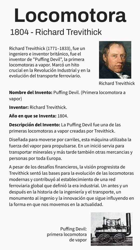 Nombre del Invento: Puffing Devil. (Primera locomotora a vapor) Inventor: Richard Trevithick. Año en que se Inventa: 1804. Descripción del Invento: La Puffing Devil fue una de las primeras locomotoras a vapor creadas por Trevithick. Diseñada para moverse por carriles, esta máquina utilizaba la fuerza del vapor para propulsarse. En un inició servia para transportar minerales y más tarde también otras mercancias y personas por toda Europa. A pesar de los desafíos financieros, la visión progresista de Trevithick sentó las bases para la evolución de las locomotoras modernas y contribuyó al establecimiento de una red ferroviaria global que definió la era industrial. Un antes y un después en la historia de la ingeniería y el transporte, un monumento al ingenio y la innovación que sigue influyendo en la forma en que nos movemos en la actualidad.