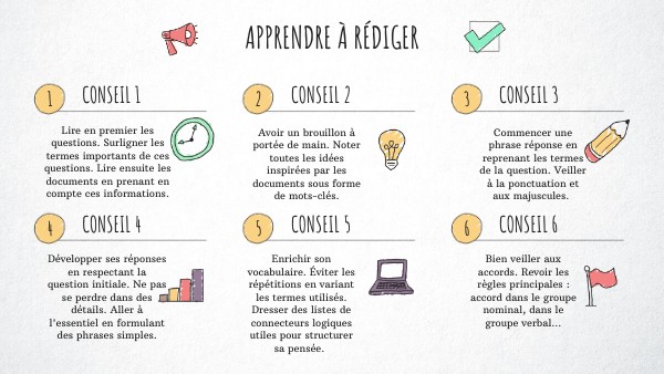 Répondre à TOUTES les questions, ne pas avoir peur de se tromper. Rédiger des phrases simples si on est moins à l'aise.