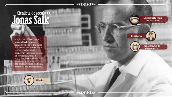 Jonas Edward Salk foi um médico, virologista e epidemologista norte-americano. Nasceu no dia 28 de Outubro de 1914 em Nova Yorque,EUA, e acabou por falecer no dia 23 de Junho de 1995 em La Jolla, Califórnia.. Jonas, foi o primeiro membro da sua família a frequentar uma universidade, formamdo-se em medicina em Nova York em 1939. Em 1942, Jonas Salk foi para a Universidade de Michigan com uma bolsa de pesquisa para desenvolver uma vacina contra influenza, mais tarde tornou-se assistente do professor de epidemilogia Em 1947, Jonas foi nomeado diretor do laboratório de pesquisa de vírus da Escola de Medicina da Universidade de Pittsburgh, mais tarde Jonas desenvolveu técnicas que levaram a uma vacina para acabar com a poliomielite paralítica, uma das doenças mais perigosas da época. Ao longo da sua carreira,Jonas, recebeu dois prémios, o Lasker-DeBakey em 1956 e a Medalha Presidencial da Liberdade em 1977.