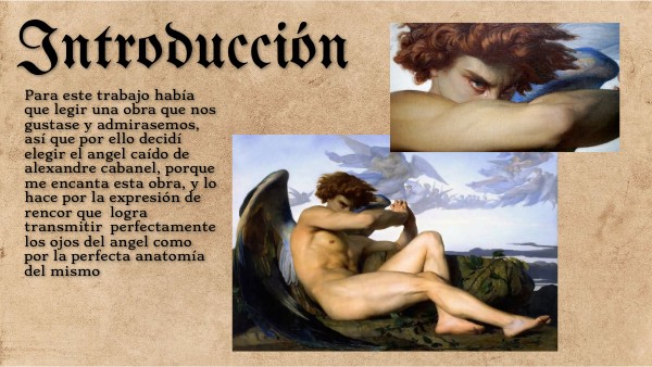 Para este trabajo había que legir una obra que nos gustase y admirasemos, así que por ello decidí elegir el angel caído de alexandre cabanel, porque me encanta esta obra, y lo hace por la expresión de rencor que logra transmitir perfectamente los ojos del angel como por la perfecta anatomía del mismo