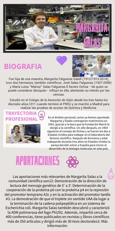 Las aportaciones más relevantes de Margarita Salas a la comunidad científica son12: Demostración de la dirección de lectura del mensaje genético de 5' a 3'. Determinación de la cooperación de la proteína p6 con la proteína p4 en la represión del promotor temprano A2c y en la activación del promotor tardío A3. La demostración de que el triplete sin sentido UAA da lugar a la terminación de la cadena polipeptídica en un sistema de Escherichia coli. Margarita Salas también descubrió y caracterizó la ADN polimerasa del fago Phi292. Además, impartió cerca de 400 conferencias, tiene publicados en revistas y libros científicos más de 350 artículos y dirigió más de 30 tesis doctorales3. Más información:
