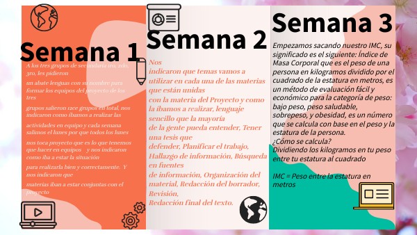 Nosindicaron que temas vamos a utilizar en cada una de las materias que están unidas con la materia del Proyecto y como la íbamos a realizar, lenguaje sencillo que la mayoría de la gente pueda entender, Tener una tesis que defender, Planificar el trabajo, Hallazgo de información, Búsqueda en fuentes de información, Organización del material, Redacción del borrador, Revisión, Redacción final del texto.