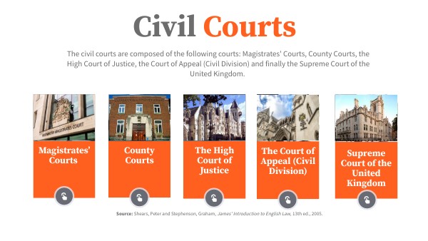 The civil courts are composed of the following courts: Magistrates' Courts, County Courts, the High Court of Justice, the Court of Appeal (Civil Division) and finally the Supreme Court of the United Kingdom.