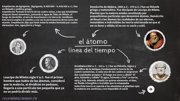 Leucipo de Mileto:siglo V a.C. fue el primer hombre que hablo de los átomos, consideró que la materia, al dividirse en pedazos, llegaría a una partícula tan pequeña que ya no se podría dividir más.