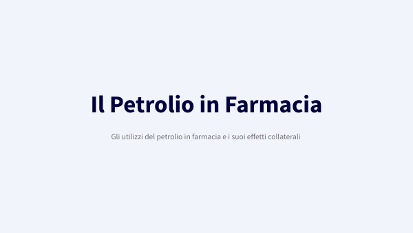 La presente presentazione tratta dell'utilizzo del petrolio in farmacia e dei suoi effetti collaterali. Il petrolio è una fonte di energia fossile che viene utilizzata in molti settori, tra cui quello farmaceutico. Tuttavia, l'utilizzo del petrolio in ambito medico può avere effetti negativi sulla salute umana, come vedremo in seguito.