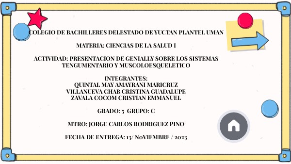 COLEGIO DE BACHILLERES DELESTADO DE YUCTAN PLANTEL UMAN MATERIA: CIENCIAS DE LA SALUD I ACTIVIDAD: PRESENTACION DE GENIALLY SOBRE LOS SISTEMAS TENGUMENTARIO Y MUSCOLOESQUELETICO INTEGRANTES: QUINTAL MAY AMAYRANI MARICRUZ VILLANUEVA CHAB CRISTINA GUADALUPE ZAVALA COCOM CRISTIAN EMMANUEL GRADO: 5 GRUPO: C MTRO: JORGE CARLOS RODRIGUEZ PINO FECHA DE ENTREGA: 13/ N0VIEMBRE / 2023