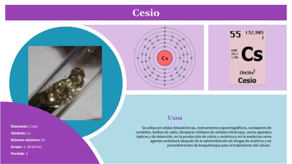 Se utiliza en celdas fotoeléctricas, instrumentos espectrográficos, contadores de centelleo, bulbos de radio, lámparas militares de señales infrarrojas, varios aparatos ópticos y de detección, en la producción de vidrio y cerámica y en la medicina como agentes antishock después de la administración de drogas de arsénico y en procedimientos de braquiterapia para el tratamiento del cáncer.