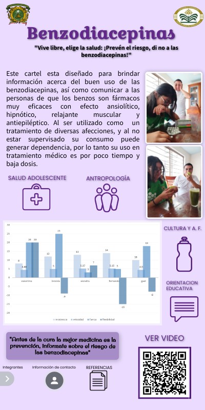 Este cartel esta diseñado para brindar información acerca del buen uso de las benzodiacepinas, así como comunicar a las personas de que los benzos son fármacos muy eficaces con efecto ansiolítico, hipnótico, relajante muscular y antiepiléptico. Al ser utilizado como un tratamiento de diversas afecciones, y al no estar supervisado su consumo puede generar dependencia, por lo tanto su uso en tratamiento médico es por poco tiempo y baja dosis.