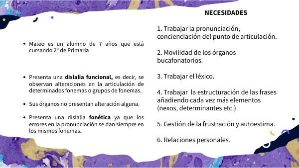 - Presenta una dislalia fonética ya que los errores en la pronunciación se dan siempre en los mismos fonemas.