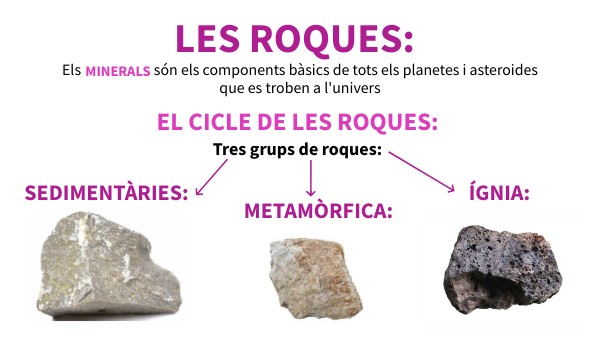 Els minerals són composts químics, d'estructura cristalina, que s'han format a través de processos naturals. Com a resultat de l'agrupació d'aquests minerals, es formen les roques.