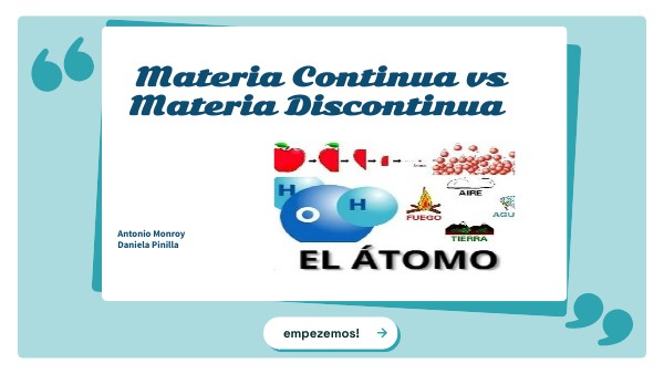 ¿Qué dice la teoría que defiende que la materia es continua?La materia es continua cuando al dividirla en partes es cada vez más pequeñas esto no cambiaran sus propiedades. Se basa en que toda la materia está compuesta por partículas mínimas llamadas átomos. ¿Qué dice la teoría que defiende que la materia es discontinua? La teoría de la discontinuidad de la materia afirma que la materia está compuesta por átomos que no se pueden dividir. las diferencias entre ambas. La primera teoría que es la continua defiende que los átomos de la materia si se pueden dividir y cambiar su composición, y en cambio la segunda que es la discontinua defiende todo lo contrario.