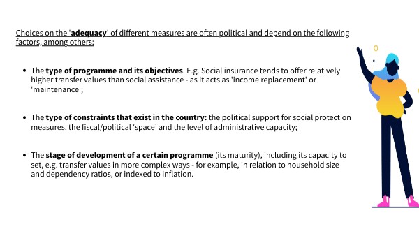 - The stage of development of a certain programme (its maturity), including its capacity to set, e.g. transfer values in more complex ways - for example, in relation to household size and dependency ratios, or indexed to inflation.