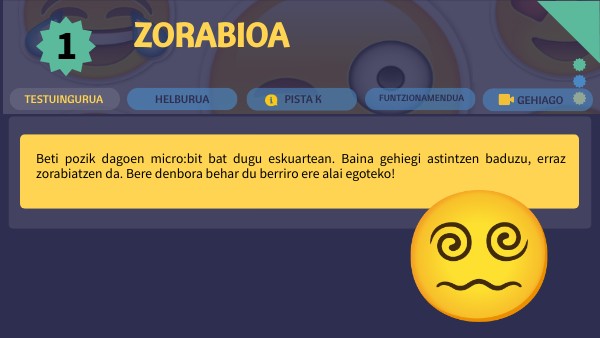 Beti pozik dagoen micro:bit bat dugu eskuartean. Baina gehiegi astintzen baduzu, erraz zorabiatzen da. Bere denbora behar du berriro ere alai egoteko!