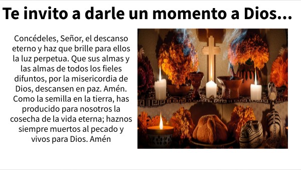 Concédeles, Señor, el descanso eterno y haz que brille para ellos la luz perpetua. Que sus almas y las almas de todos los fieles difuntos, por la misericordia de Dios, descansen en paz. Amén. Como la semilla en la tierra, has producido para nosotros la cosecha de la vida eterna; haznos siempre muertos al pecado y vivos para Dios. Amén