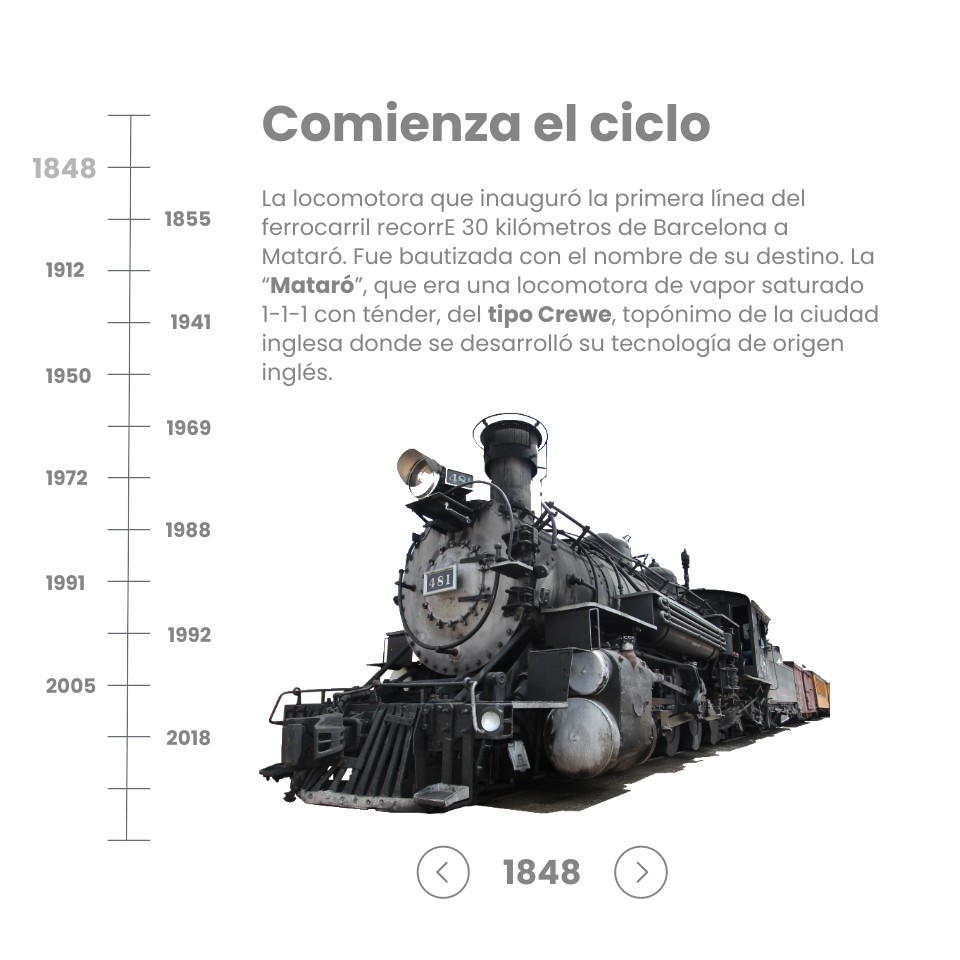 La locomotora que inauguró la primera línea del ferrocarril recorrE 30 kilómetros de Barcelona a Mataró. Fue bautizada con el nombre de su destino. La “Mataró”, que era una locomotora de vapor saturado 1-1-1 con ténder, del tipo Crewe, topónimo de la ciudad inglesa donde se desarrolló su tecnología de origen inglés.