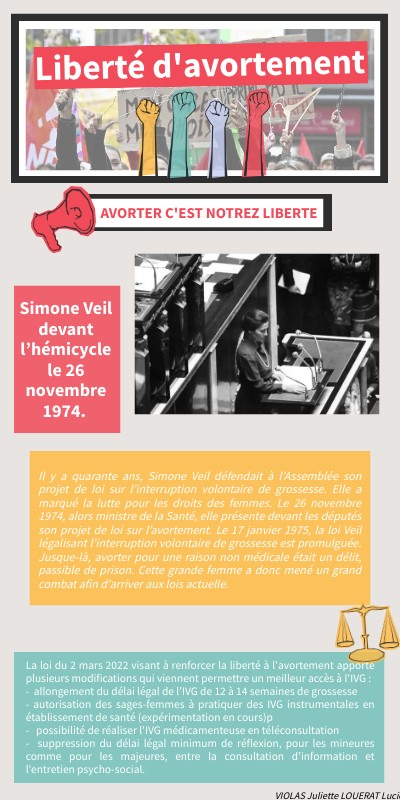 Il y a quarante ans, Simone Veil défendait à l’Assemblée son projet de loi sur l’interruption volontaire de grossesse. Elle a marqué la lutte pour les droits des femmes. Le 26 novembre 1974, alors ministre de la Santé, elle présente devant les députés son projet de loi sur l’avortement. Le 17 janvier 1975, la loi Veil légalisant l’interruption volontaire de grossesse est promulguée. Jusque-là, avorter pour une raison non médicale était un délit, passible de prison. Cette grande femme a donc mené un grand combat afin d'arriver aux lois actuelle.