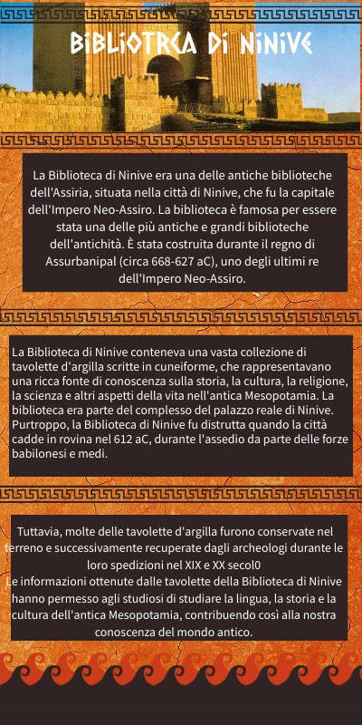 La Biblioteca di Ninive conteneva una vasta collezione di tavolette d'argilla scritte in cuneiforme, che rappresentavano una ricca fonte di conoscenza sulla storia, la cultura, la religione, la scienza e altri aspetti della vita nell'antica Mesopotamia. La biblioteca era parte del complesso del palazzo reale di Ninive. Purtroppo, la Biblioteca di Ninive fu distrutta quando la città cadde in rovina nel 612 aC, durante l'assedio da parte delle forze babilonesi e medi.