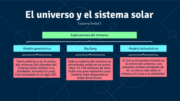 El Sol se encuentra inmóvli en el centro del universo. Los planetas orbitan alrededor de él. La tierra rota sobre sí misma y la Luna a su alrededor.
