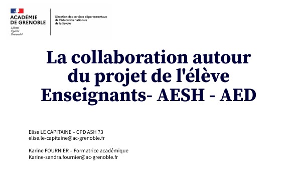 Elise LE CAPITAINE – CPD ASH 73elise.le-capitaine@ac-grenoble.frKarine FOURNIER – Formatrice académiqueKarine-sandra.fournier@ac-grenoble.fr