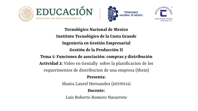 Tecnológico Nacional de MexicoInstituto Tecnológico de la Costa Grande Ingenieria en Gestión Empresarial Gestión de la Producción II Tema 2: Funciones de asociación: compras y distribución Actividad 3: Almacenamiento y Gestion de transporte Presenta: Shaira Laurel Hernandez (20570114) Docente: Luis Roberto Romero Navarrete