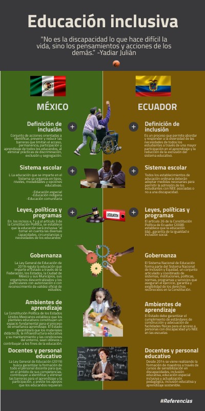 Para el Ministerio de Educación de Ecuador la Educación Inclusiva debe ser concebida como “un proceso que permite abordar y responder a la diversidad de las necesidades de todos los estudiantes a través de una mayor participación en el aprendizaje y la reducción de la exclusión del sistema educativo.” Lo cual implica “cambios y modificaciones de contenidos, enfoques, estructuras y estrategias basados en una visión común y la convicción de que es responsabilidad del Sistema Educativo educar a todos los niños, niñas y adolescentes.” La educación inclusiva permite que los estudiantes y docentes se sientan cómodos ante la diversidad y que la perciban como una oportunidad para enriquecer el entorno de aprendizaje. (Inclusion and education, 2023)