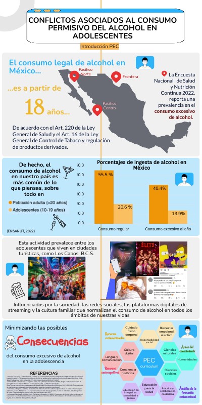 - Ramírez-Toscano Y, Canto-Osorio F, Carnalla M, Colchero MA, Reynales-Shigematsu LM, Barrientos-Gutiérrez T, López-Olmedo N. Patrones de consumo de alcohol en adolescentes y adultos mexicanos: Ensanut Continua 2022. Salud Publica Mex. 2023;65(supl 1):S75-S83. https://doi.org/10.21149/14817 - Monterrubio-Cordero, J. C., & Equihua-Elías, G. C. (2011). Consumo de alcohol, drogas y actividad sexual en el spring break en Acapulco, México. Teoría y Praxis, (10), 77-98. Recuperado de https://generaconocimiento.segob.gob.mx/sites/default/files/document/biblioteca/1095/20230217-consumo-de-alcohol-drogas-y-actividad-sexual-en-el-spring-break-en-acapulco-mexico.pdf - Alarcón,J., & Segovia, L. (2021). Normalización del consumo de sustancias psicoactivas en series televisivas para población juvenil. (M. Quiroz, & D. Zamora, Edits.) Gestión de la Seguridad y Salud en el Trabajo, 4(4). Recuperado de https://journal.poligran.edu.co/index.php/gsst/issue/view/253 - Palomares-Sánchez, P.; Hidalgo-Marí, T. y Segarra-Saavedra, J. (2022). El consumo de alcohol, tabaco y drogas en los jóvenes: un estudio sobre las teen series españolas recientes (2015-2021). Dígitos. Revista de Comunicación Digital, 8: XX-XX. DOI: 10.7203/rd.v1i8.227 .