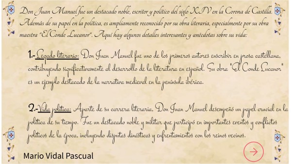 1.- Legado literario: Don Juan Manuel fue uno de los primeros autores enscribir en prosa castellana, contribuyendo significativamente al desarrollo de la literatura en español. Su obra "El Conde Lucanor" es un ejemplo destacado de la narrativa medieval en la península ibérica.